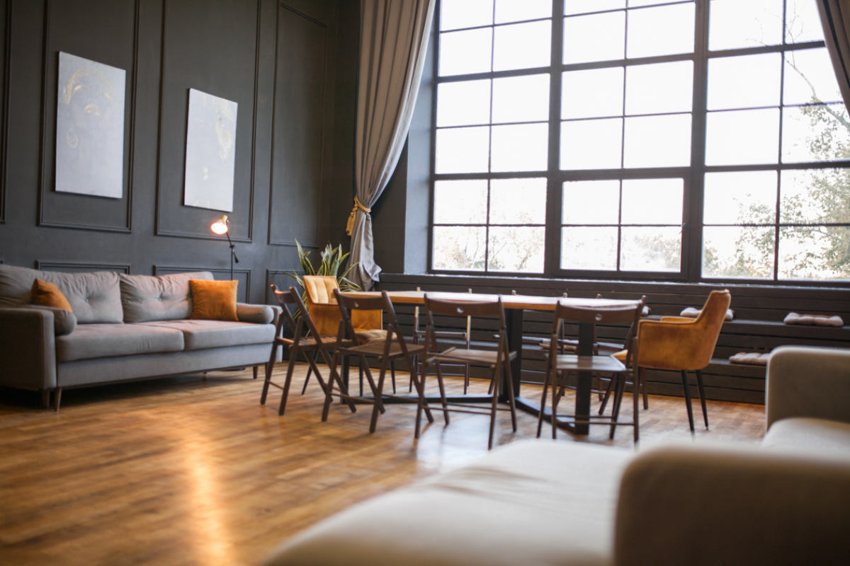 СКАНДИ (Scandi) — просторный минималистичный зал с двумя деревянными акцентными стенами и серой бетонной фактурой. Большие окна дают мягкий естественный свет, а лаконичная мебель с кожаными креслами дополняет сканди‑настроение.