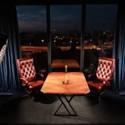 Студия 35 выполнена в балийском стиле, две фактурные стены, одна из них дополнена деревянным слебом. в зале имеется лестница с круглыми ступенями, кресла из натурального дуба и кожи и также имитация больших булыжников.
