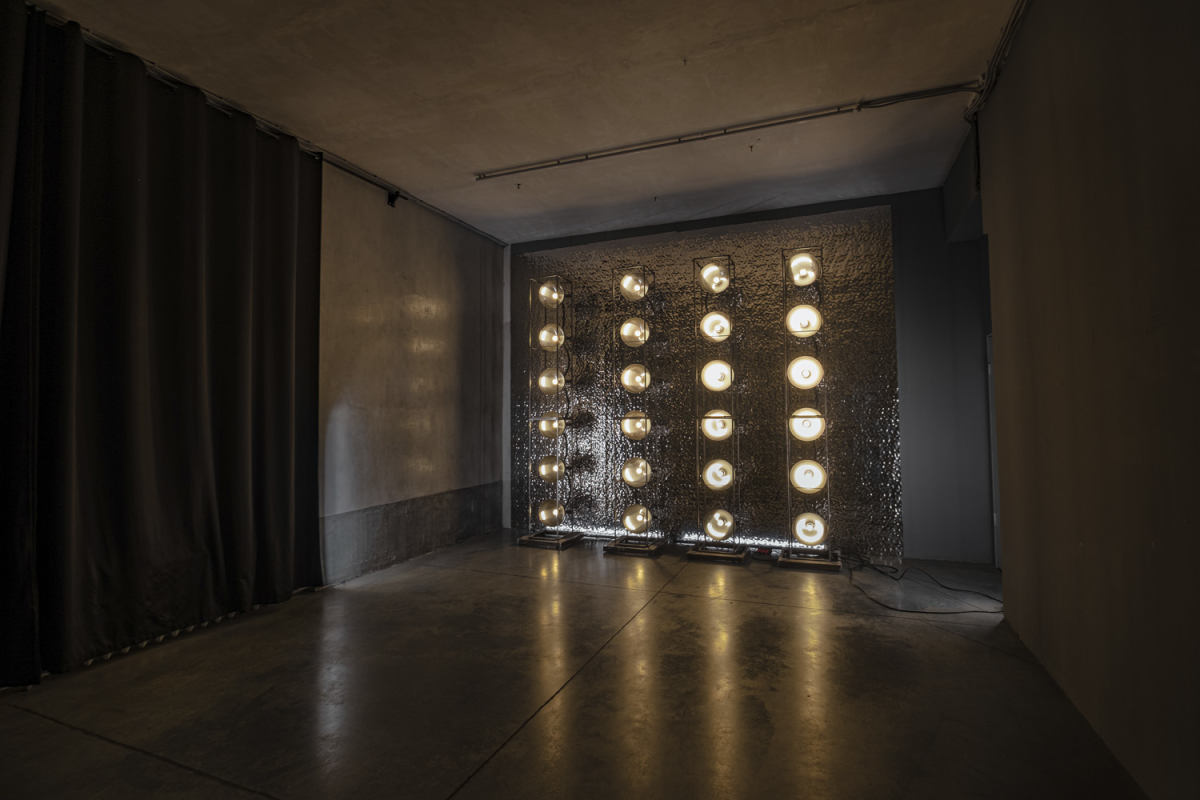 Зал в тёмных, мрачных тонах. Большие окна, стены окрашены в чёрный, серый, синие цвета. Творческие зоны