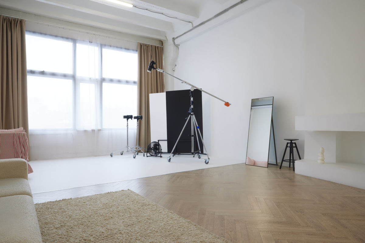 Два окна с блэк-аут шторами и полный комплект профессионального осветительного оборудования Profoto.