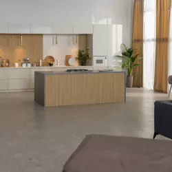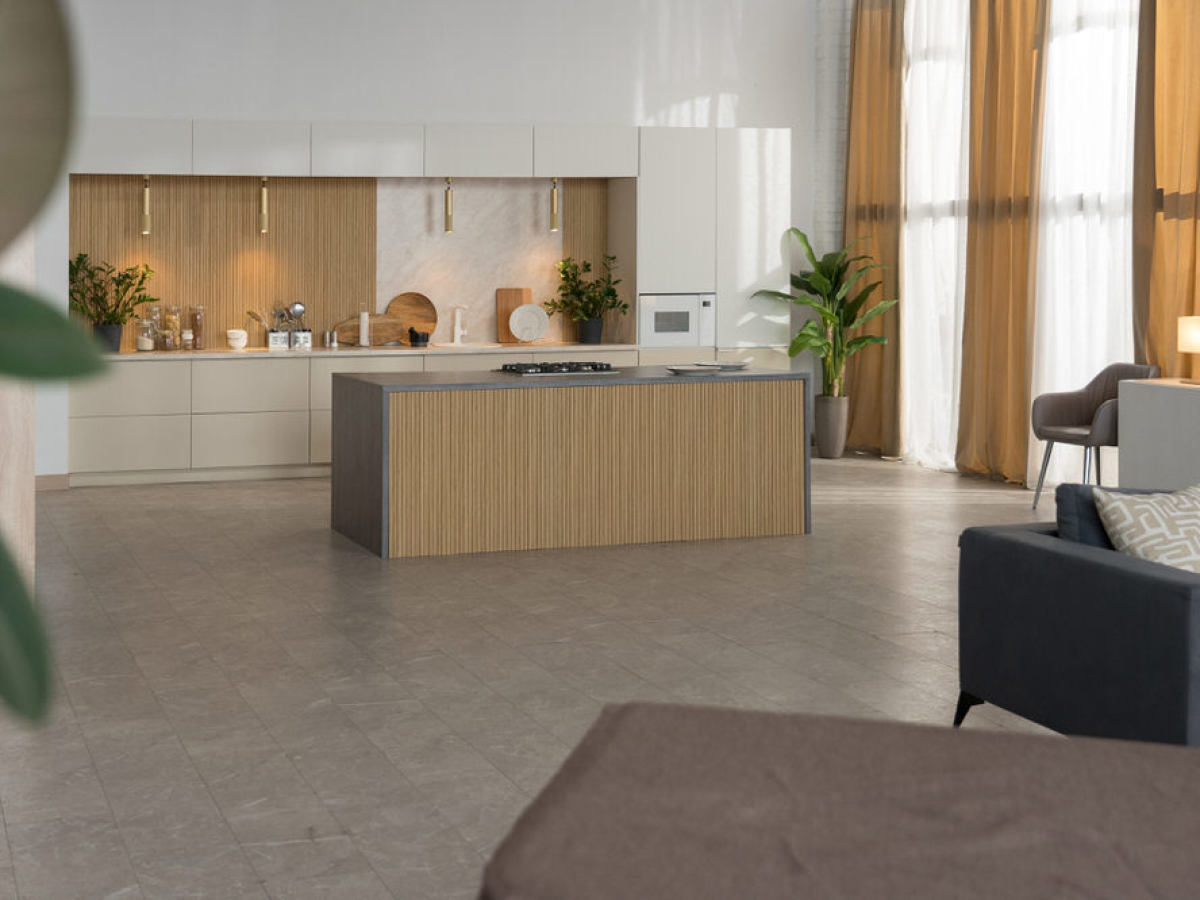 Современная просторная и полностью функциональная кухня с островом и столовой.