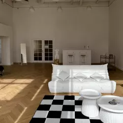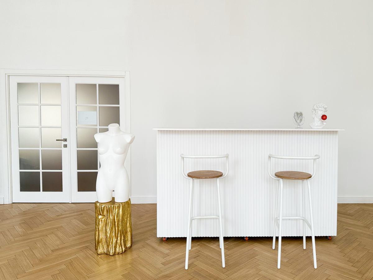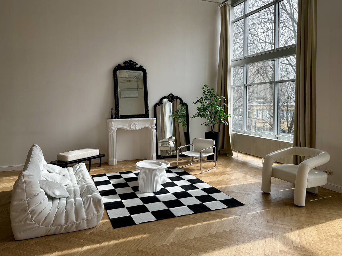 Зал SIXTY - зал с белой циклорамой и мебелью в стиле 60х