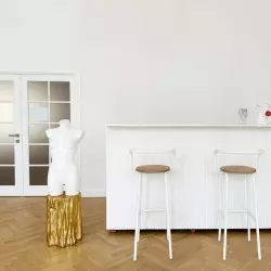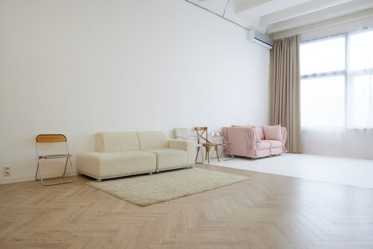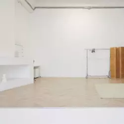 Светлый зал площадью 60 кв.м. Идеально подходит для съемки контента. Зал состоит из двух зон: белой стены с белым полом, соединяющимися под прямым углом, и интерьерной зоной со светло-бежевым паркетом, уложенным венгерской елкой, и имитацией камина.