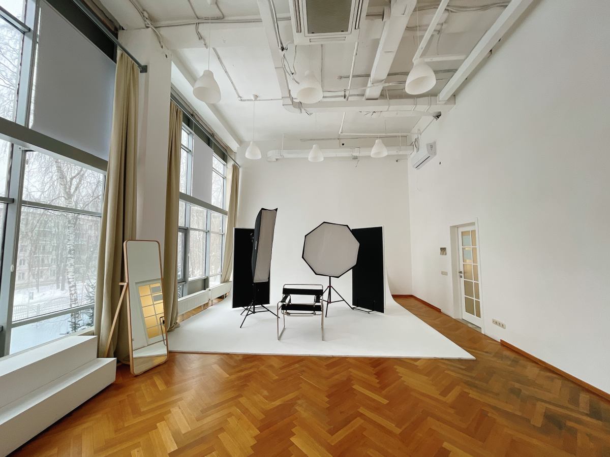 Современная фотостудия с циклорамой в форме чаши. В стоимость включено всё: профессиональное освещение, как импульсное, так и постоянное. Просторное светлое помещение с большими окнами и блэкаут-шторами. Удобное расположение — 7 минут от метро, есть бесплатная парковка.