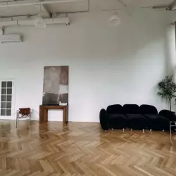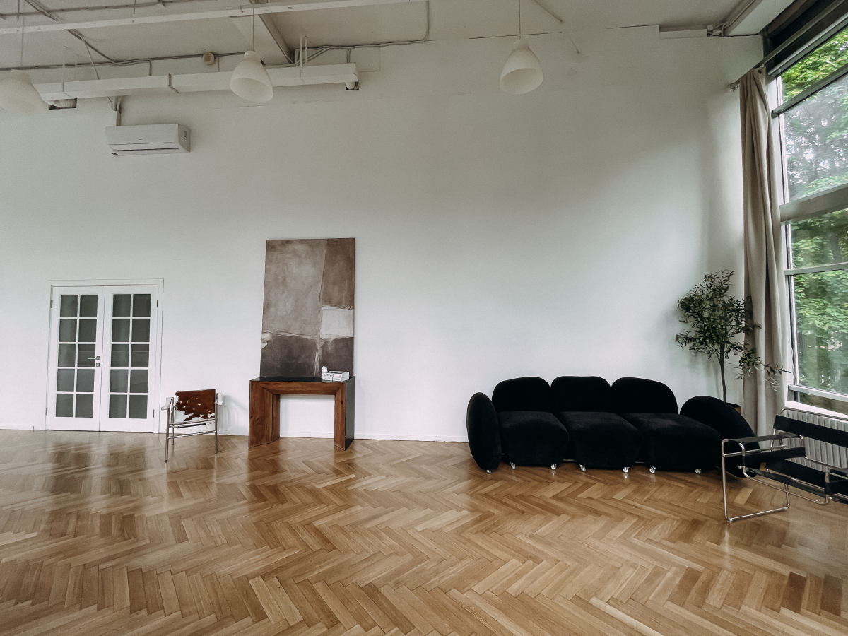 102 м² пространства для творчества с большими окнами на две стены. В зале уложен паркет "елочкой" и белые стены. Циклорама и дизайнерская мебель.