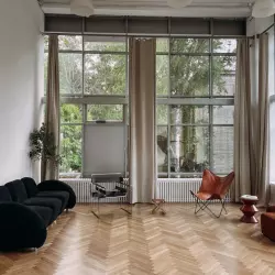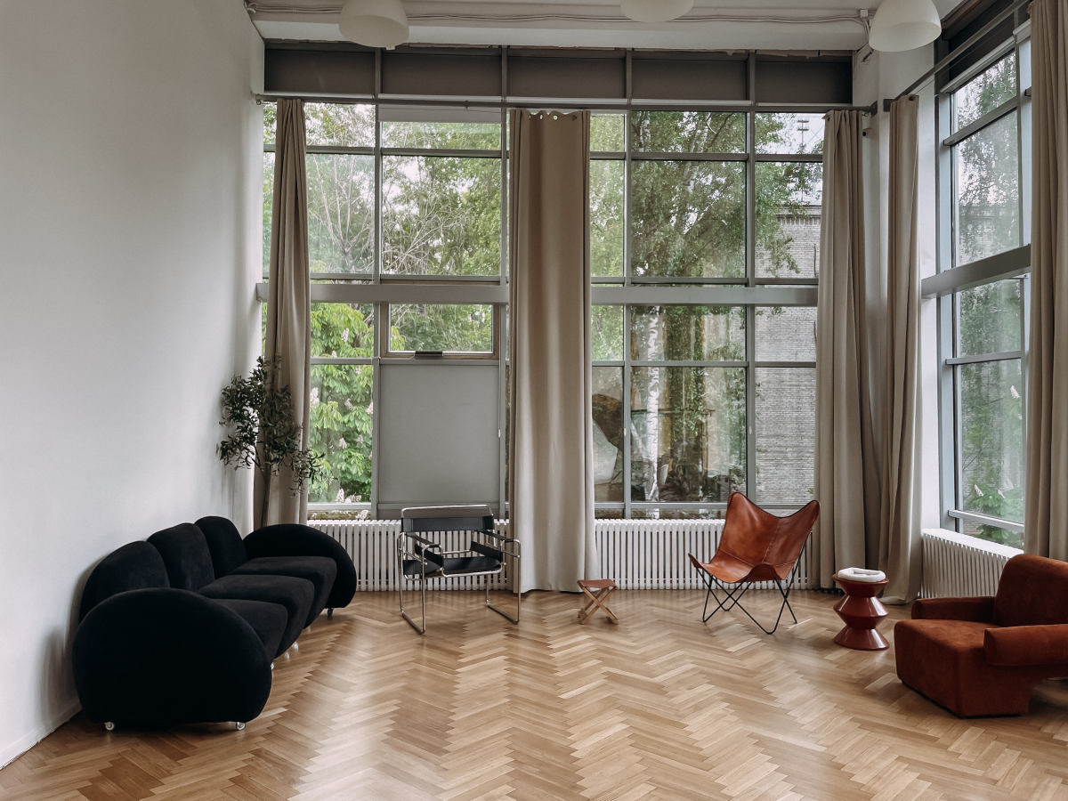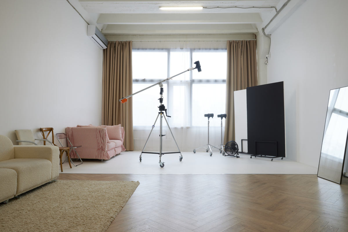 Просторное помещение с высокими потолками, панорамными окнами, неоновой подсветкой и блэк-аут шторами для полного контроля над светом. Уютная зона отдыха и удобное расположение сделают процесс съемки комфортным.