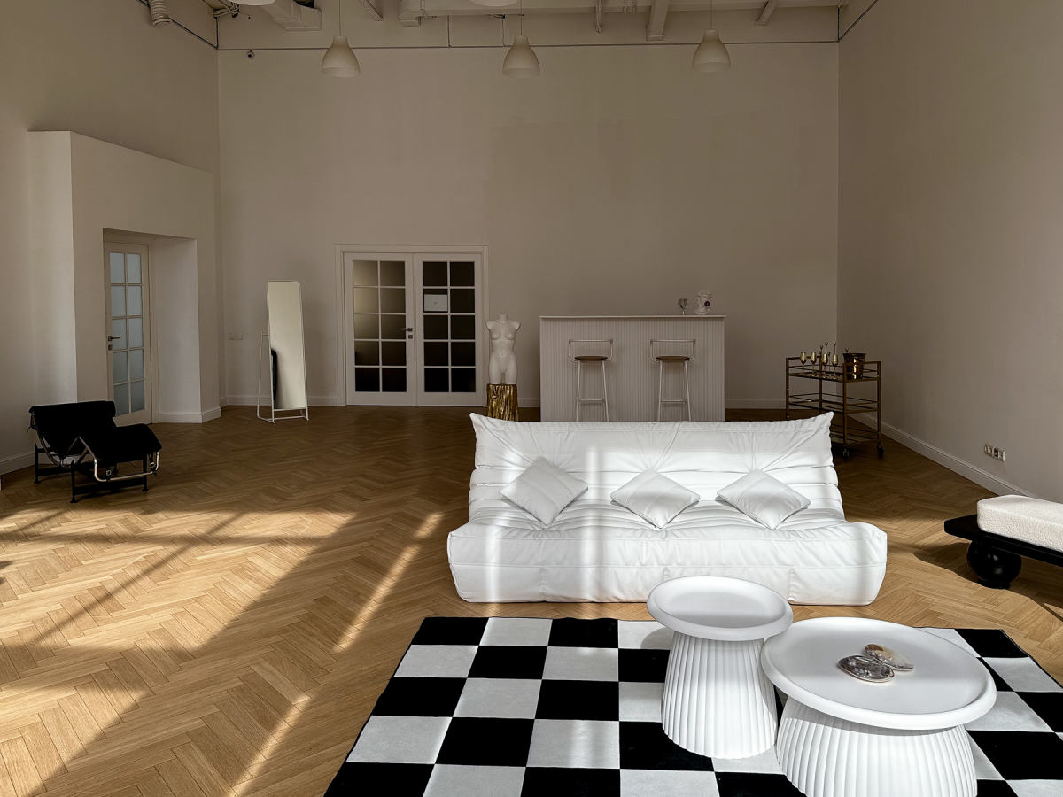 Просторный зал 80 м², светлый с большой циклорамой и мебелью
