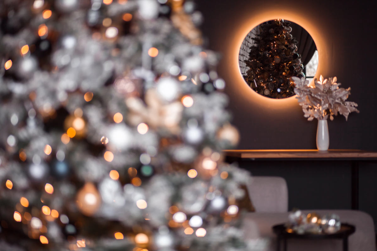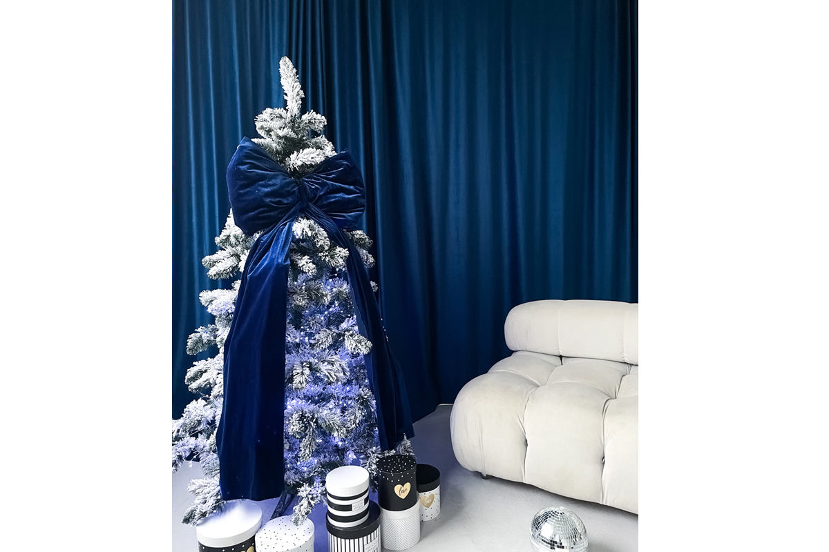 - Каминная зона с бело-голубо-золотой елью, подвесными звездами и лошадкой-качалкой;