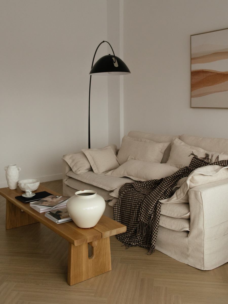 Стильный неоклассический интерьер, сдержанные цвета, огромные окна в пол.