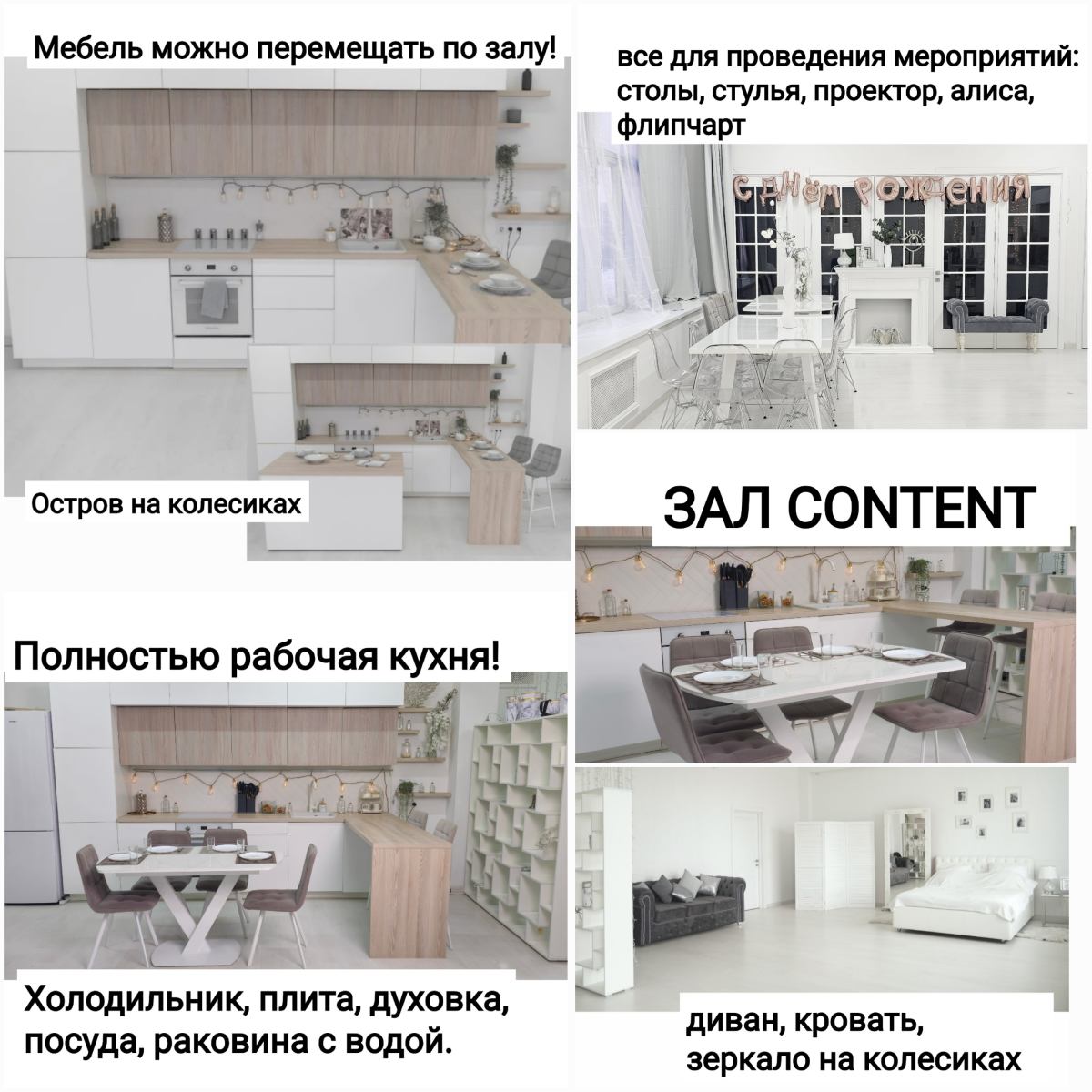ЗАЛ СОNТЕNТ - просторный полностью белый ОЧЕНЬ светлый зал 80 м² с естественным светом, большими окнами, белыми полами, есть шторы блэкаут. Этот зал идеально подходит для различных съёмок контента в едином стиле: семейных, lоvеstrоry, контента для соц сетей и тд и проведения мероприятий.