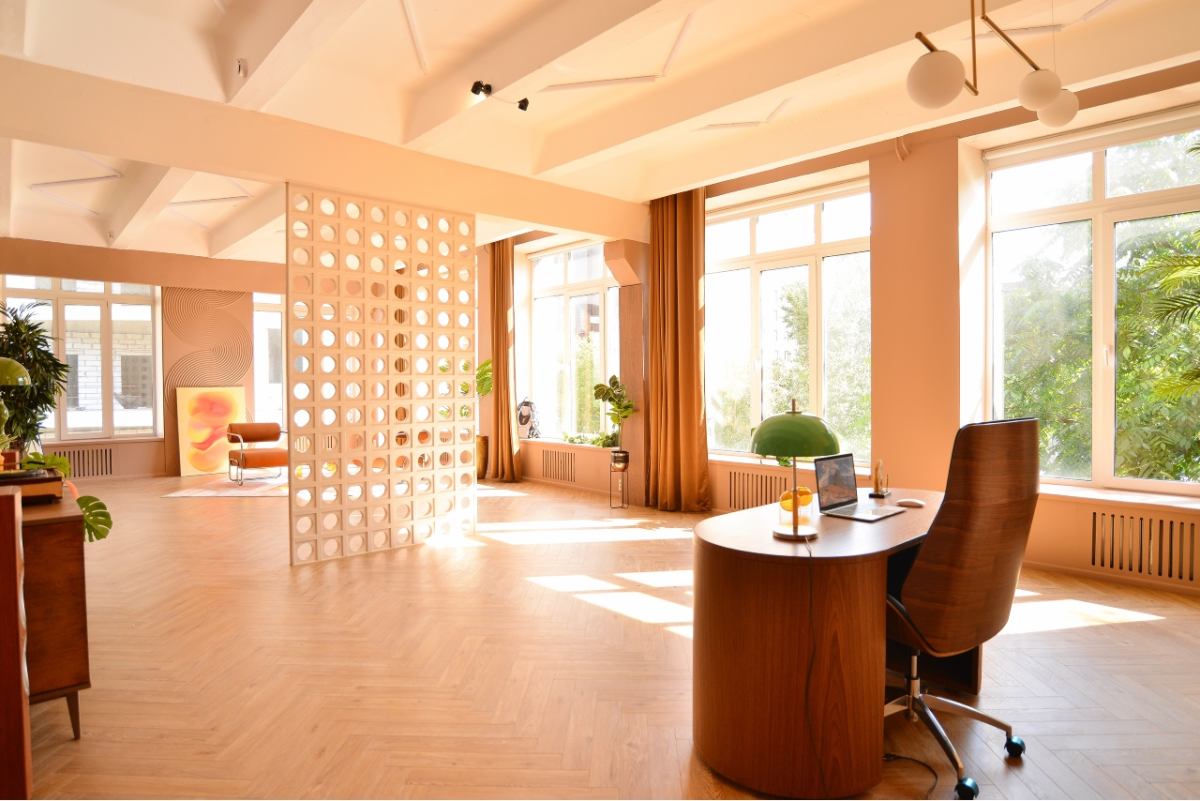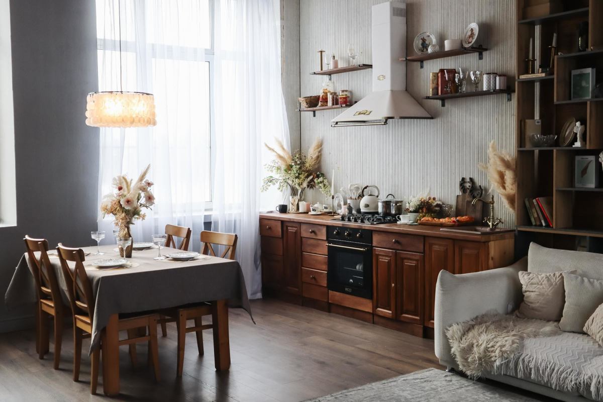Стилистика Mid-century modern, с преобладанием тёплого дерева, геометричных форм, винтажного текстиля и декоративных элементов.
