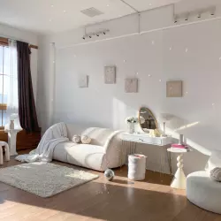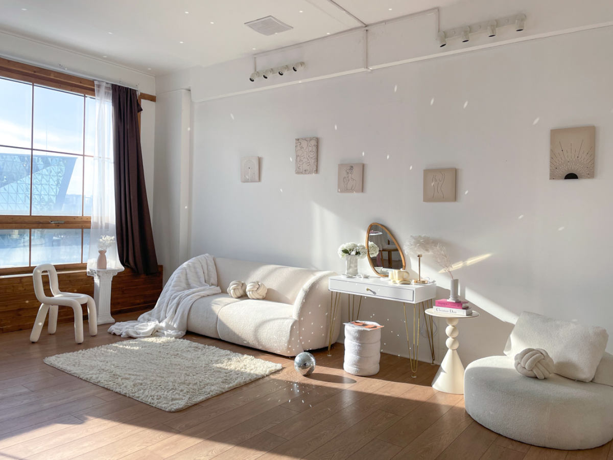 Уютный зал подходящий для съемок lovestory, семейных, детских, пижамных и бельевых. В зале предусмотрено 3 основных зоны. Гостиная часть, спальня с кроватью и барная зона.