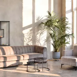 Интерьерный зал в африканском и тропическом стиле, с панорамными мансардными окнами, растениями и красивой мебелью.
