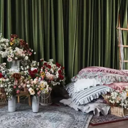 60 кв. м., потолок 5 метров, большое окно 5×3 метра на солнечную сторону. Тёмно-серые шторы блэкаут. Большой выбор тканей, фонов и предметов интерьера, идеально сочетающихся друг с другом.