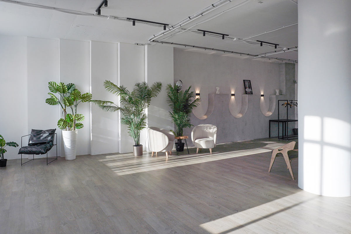 Просторный зал 80 м², светлый с большой циклорамой и мебелью