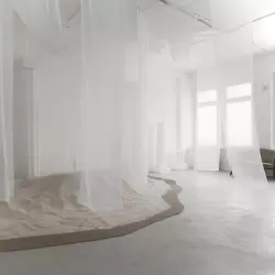 Зал с декорациями различных форм и цветов с панорамным окном и высокими потолками. Все фигуры легко передвигаются по залу.