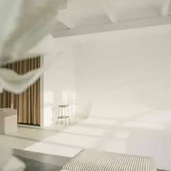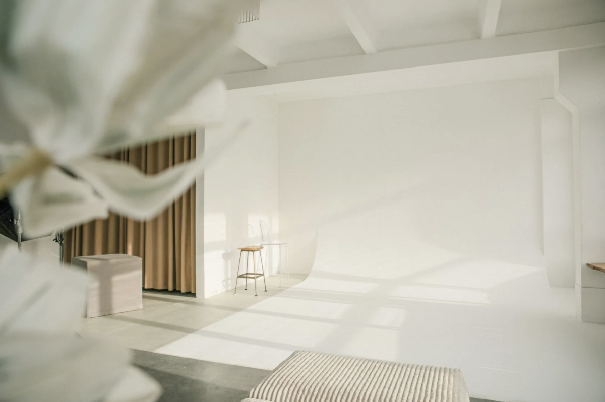 Просторный зал с циклорамой, стильной мебелью и с большим количеством естественного света.