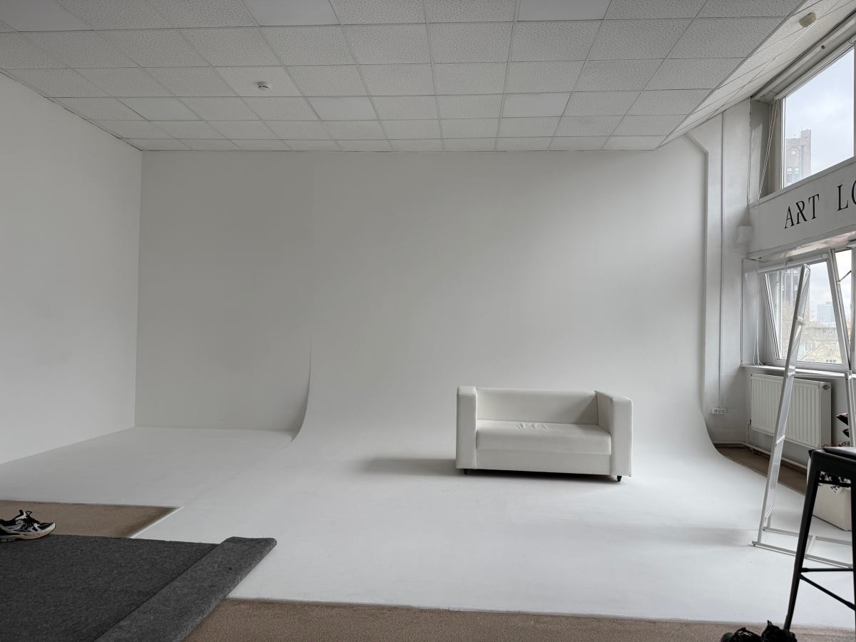 Зал с белой циклорамой, большими окнами и серыми фактурными стенами.