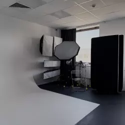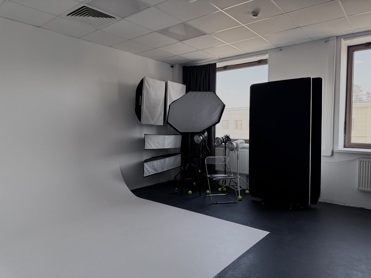 Предметный зал с 3 импульсными источниками света по 300 Дж, постоянным светом 300 Вт, предметным столом, белым и чёрным фоном, а также ширмой для переодевания. В наличии октабокс на журавле, 3 софтбокса, 2 стрипбокса, 2 флага и множество аксессуаров и фонов для съёмки.