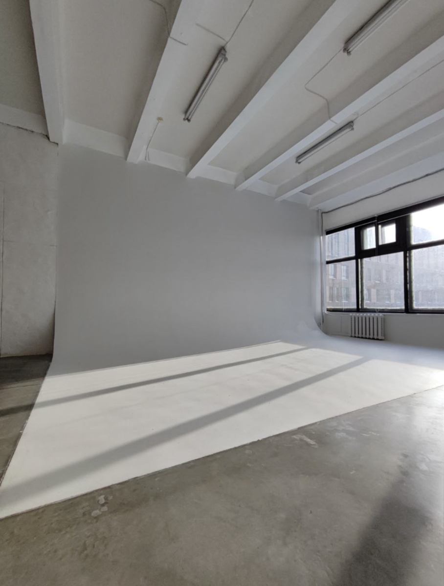 Просторный зал с белой циклорамой и большими окнами подойдёт для различных идей.