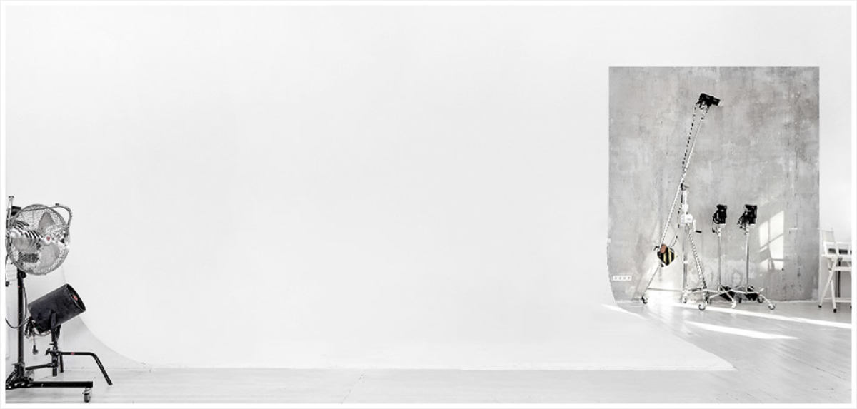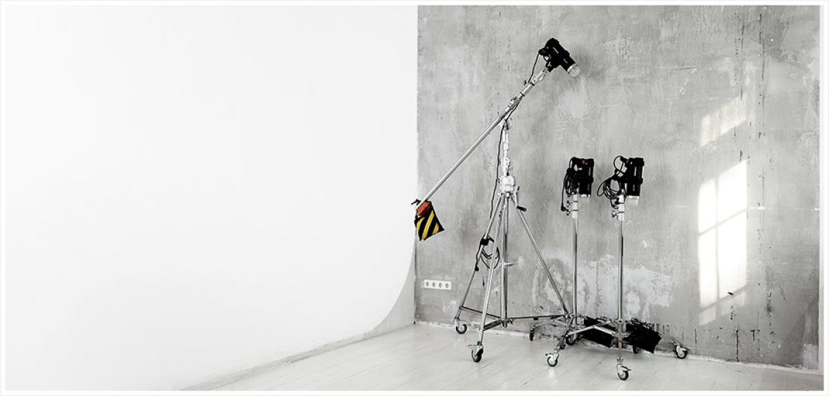 Зал с белой циклорамой 5х5 и двумя оригинальными локациями. В стоимость включены 3 импульсных и три постоянных источника.