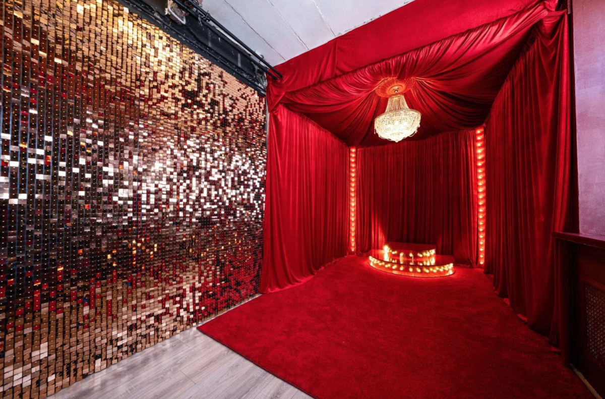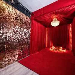 Красное бархатное пространство, с подиумом, театральным занавесом и роскошной люстрой, идеально для творческих проектов. Старый цирк, театр