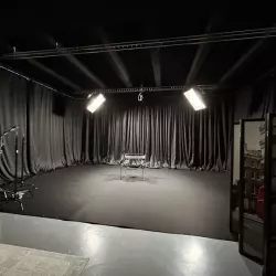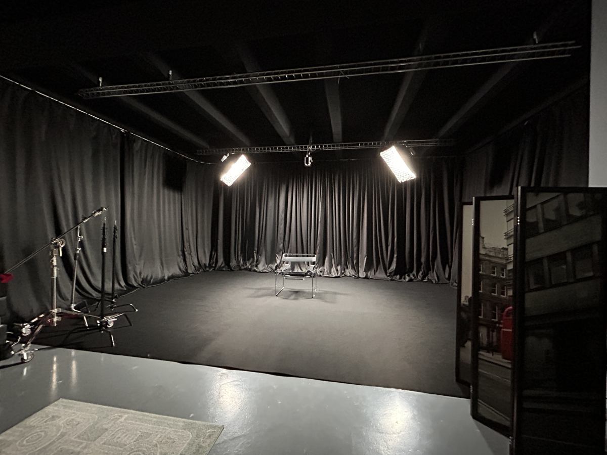 Темный зал c необычным дизайнерским решением. Подойдет для съемок подкастов, творческих съемок и различных fashion-задумок.