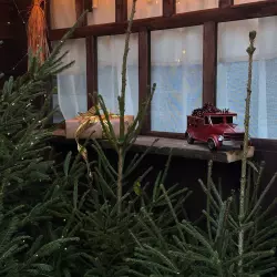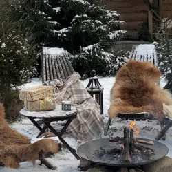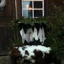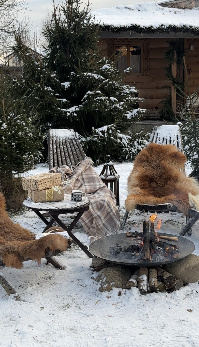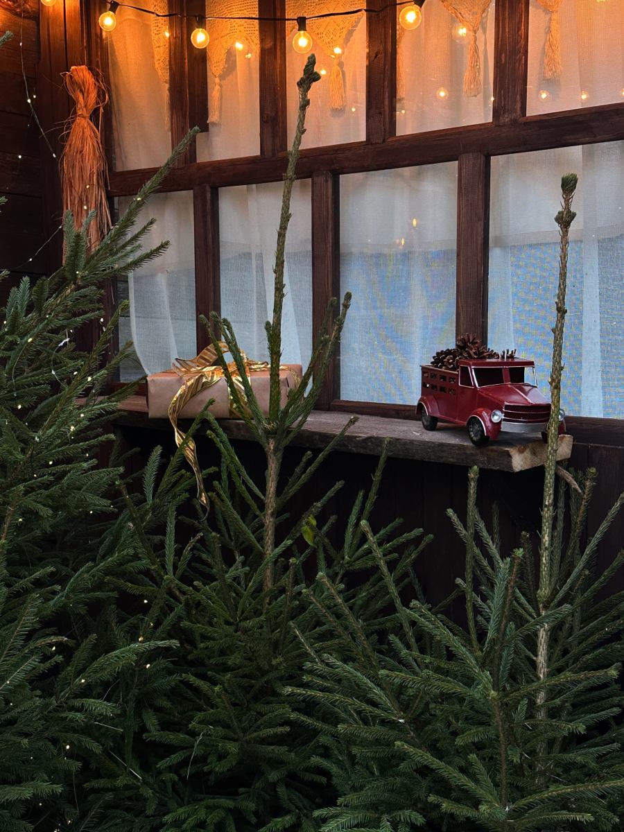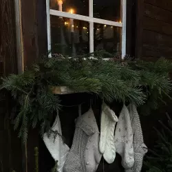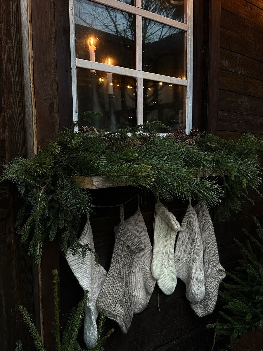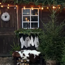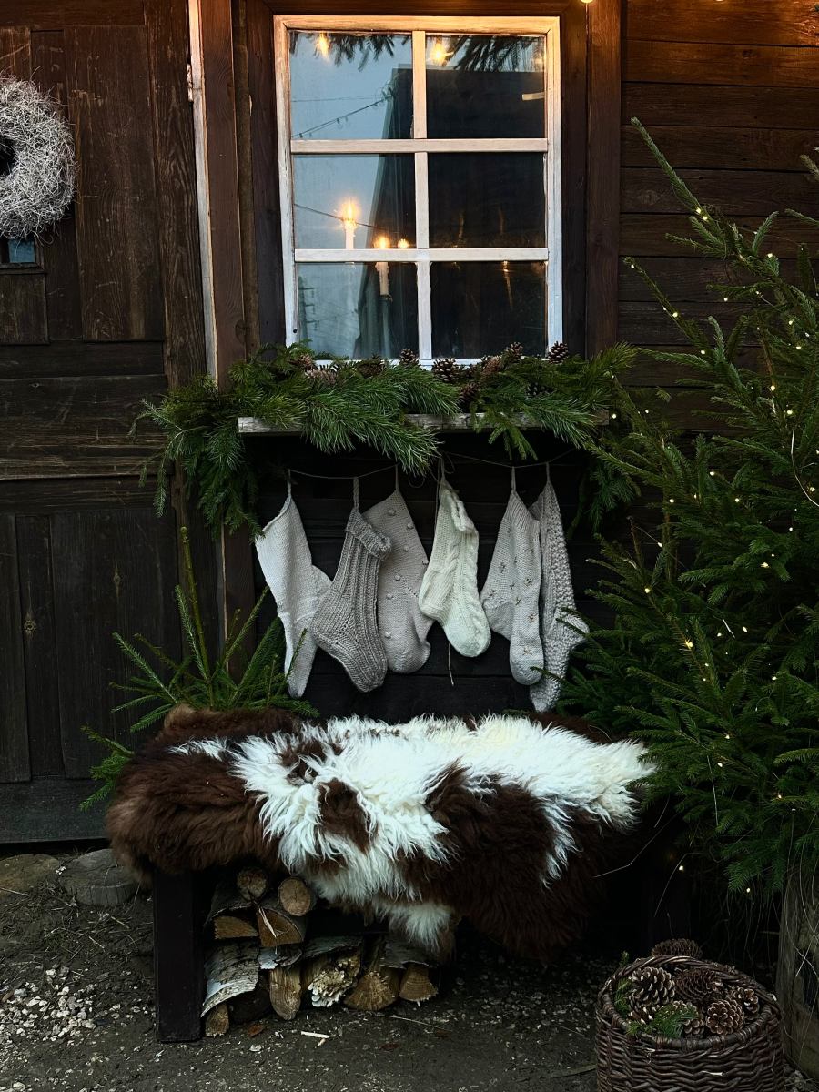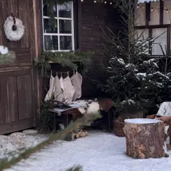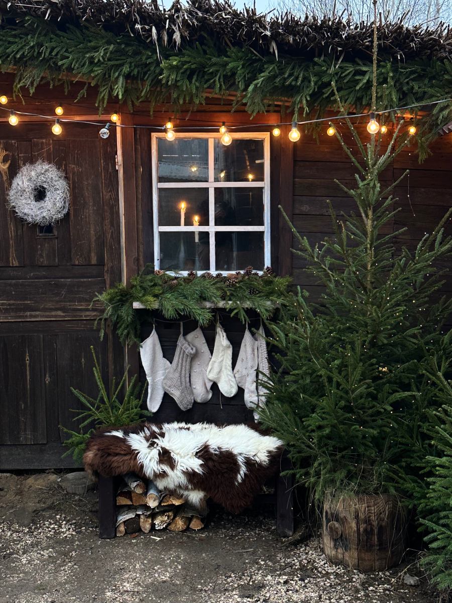Новые зимние фотозоны в "Дачных Историях"— уютный деревянный домик, еловые ветви, теплые огоньки, свечи в окне и вязаные носочки, создающие атмосферу праздника.