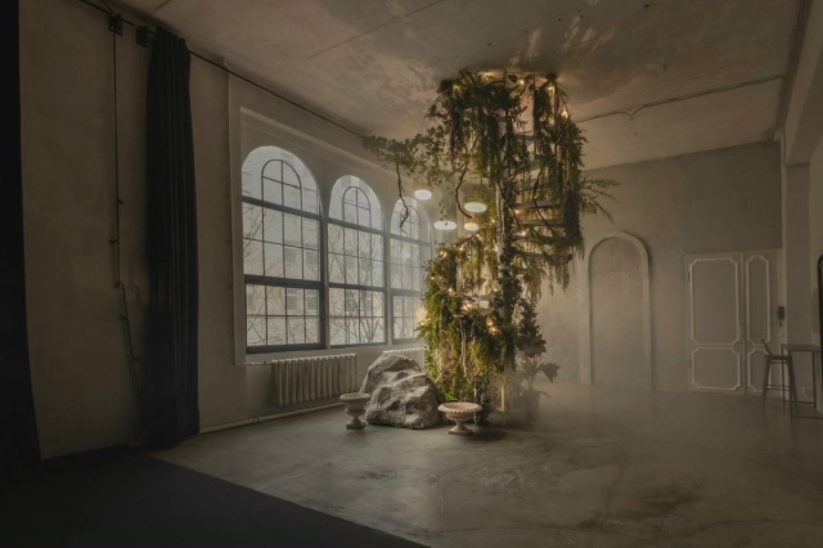 Большой зал 43м2 с камином, роскошной люстрой-качелями, на которой можно сидеть или стоять, и высокими окнами. Потолок - 4,75м. Винтажный стиль, романтичный. Студия с зеленью, растениями, травяной декор на стенах