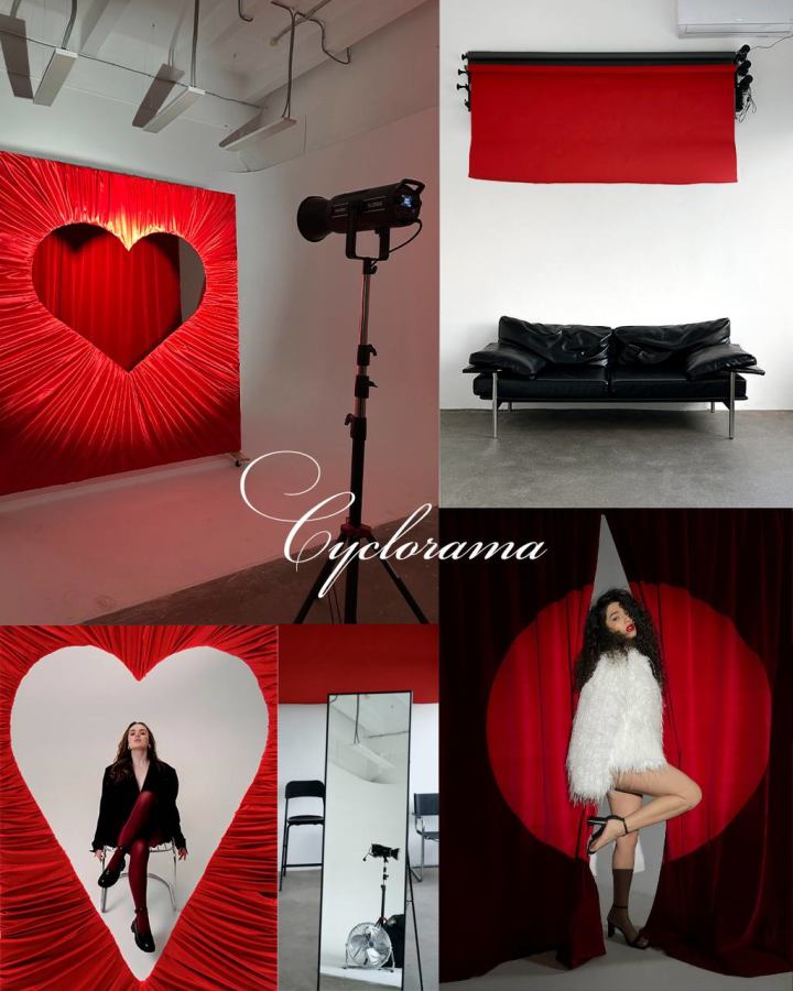 Очень качественная, ровная, просторная белая угловая циклорама, которая не пачкается при использовании. Панорамные окна (есть шторы блэкаут). Ширина циклорамы - 8 м, высота - 4,5 м, вылет - 5,5 м, глубина зала - 12,8 м.. Не нужно отдельно оплачивать покраску циклорамы, потому что она НЕ ПАЧКАЕТСЯ.