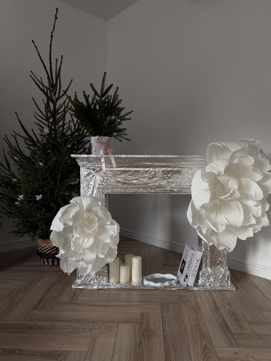 Большой зал 43м2 с камином, роскошной люстрой-качелями, на которой можно сидеть или стоять, и высокими окнами. Потолок - 4,75м. Винтажный стиль, романтичный. Студия с зеленью, растениями, травяной декор на стенах