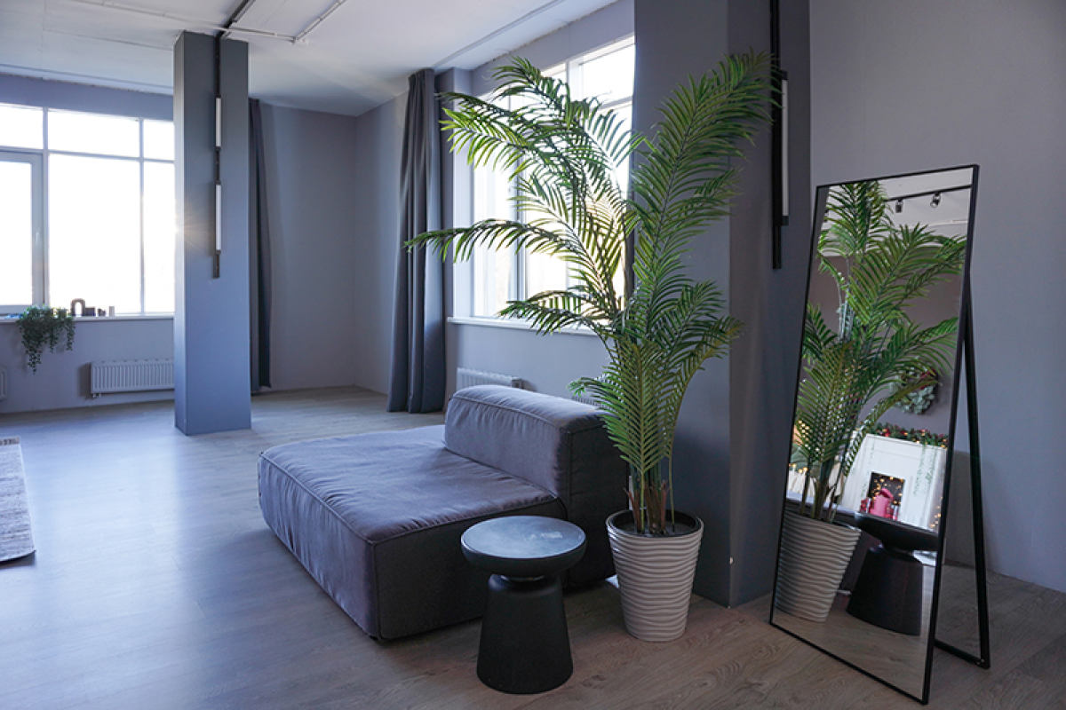 Просторный зал с циклорамой, стильной мебелью и с большим количеством естественного света.