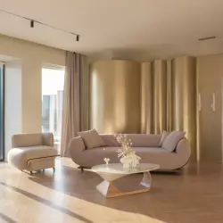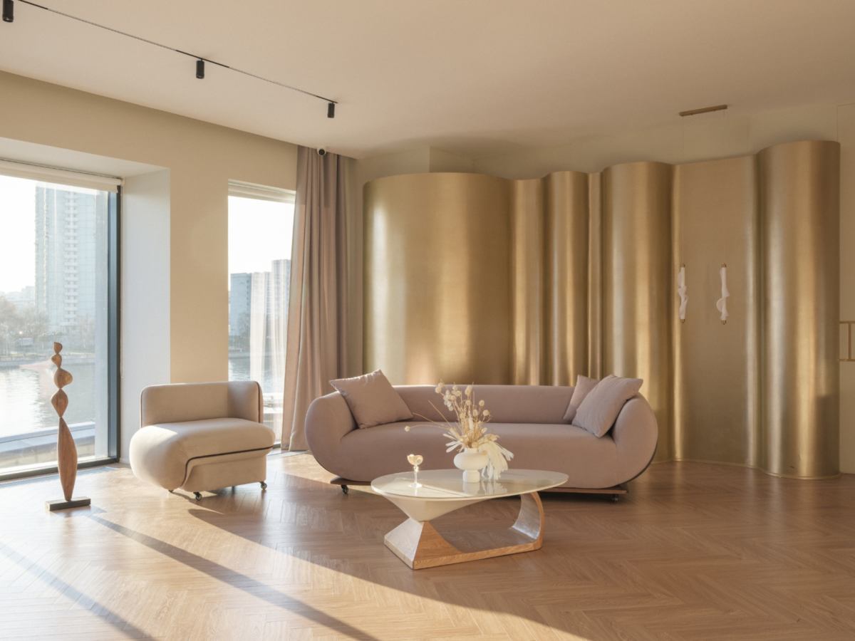 Причудливые параметрические конструкции, панорамные окна с видом на реку, дизайнерская мебель.