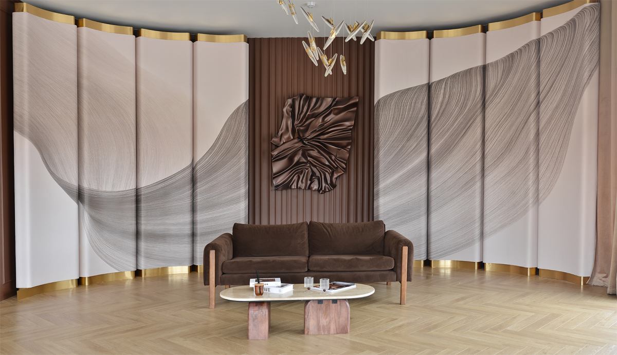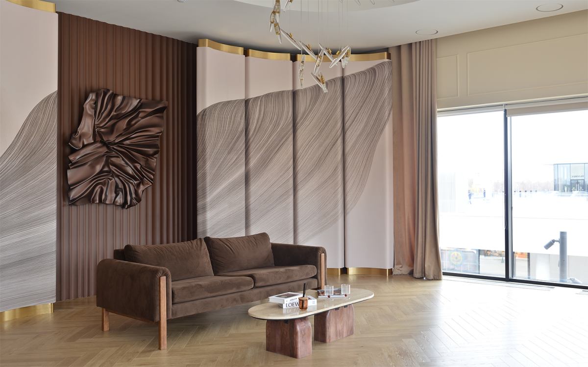 Стильный минималистичный зал в тёмных оттенках с циклорамой и зоной интерьера.
