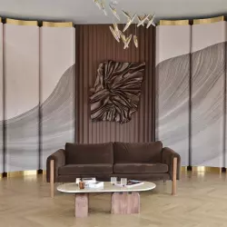 Светлые песочные фактурные стены и лаконичный декор из разных геометрических форм, которые можно сочетать под индивидуальные задачи.