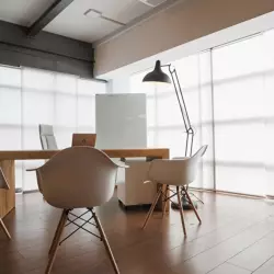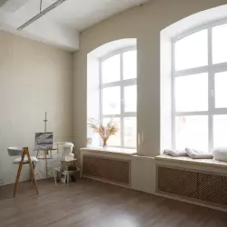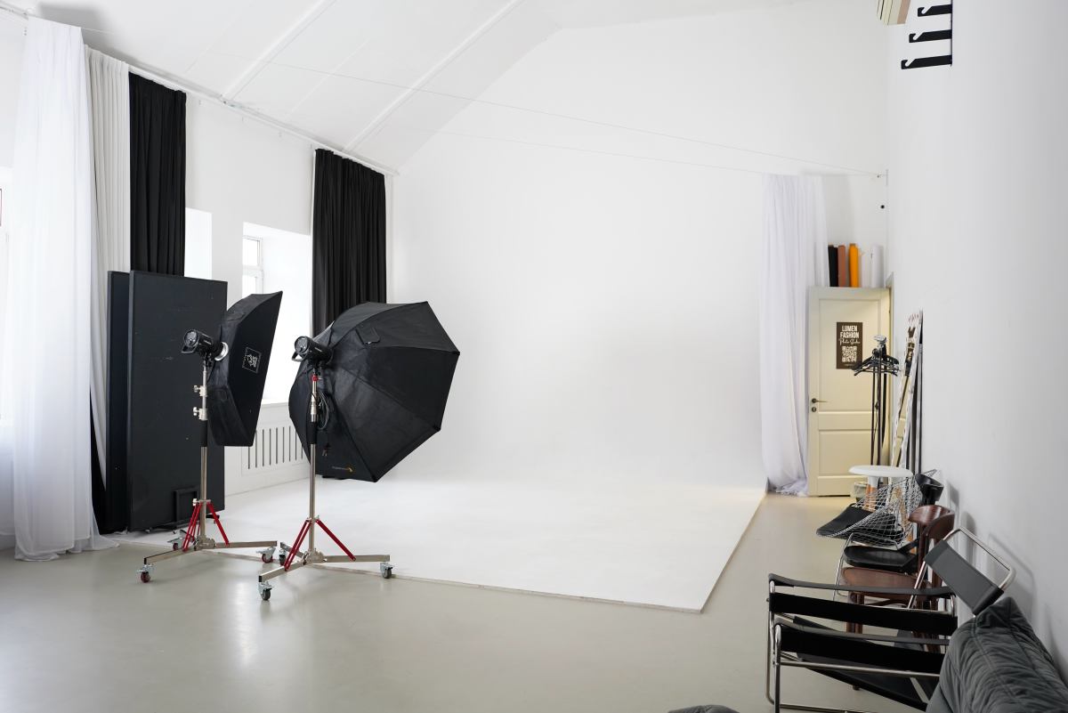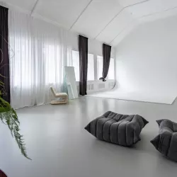 Просторный зал с циклорамой, стильной мебелью и с большим количеством естественного света.