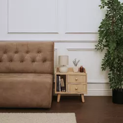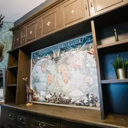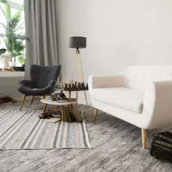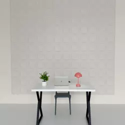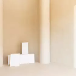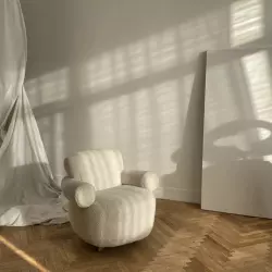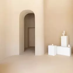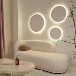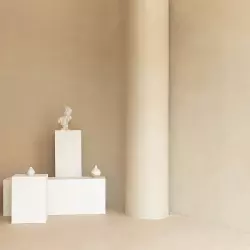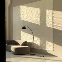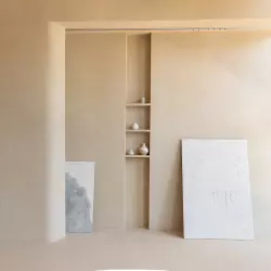 Светлые песочные фактурные стены и лаконичный декор из разных геометрических форм, которые можно сочетать под индивидуальные задачи.