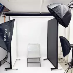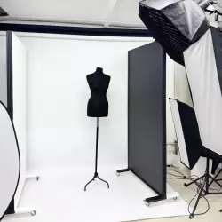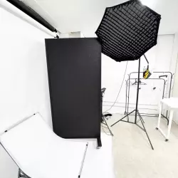 Предметный зал с 3 импульсными источниками света по 300 Дж, постоянным светом 300 Вт, предметным столом, белым и чёрным фоном, а также ширмой для переодевания. В наличии октабокс на журавле, 3 софтбокса, 2 стрипбокса, 2 флага и множество аксессуаров и фонов для съёмки.