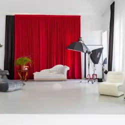 Зал "RED" с различными зонами для съемок, зона с красной бархатной шторой, циклорама 5x5, окна по всему периметру.