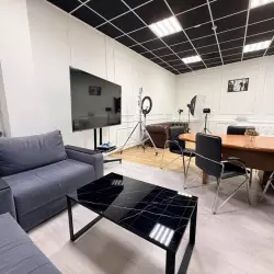 Студия для подкастов, YouTube-шоу, интервью и онлайн-трансляций. Отдельная комната пультовой. Звукоизоляция. Свет, пультовая и камеры уже в студии.