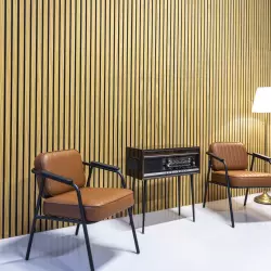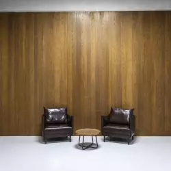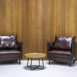 СКАНДИ — просторный минималистичный зал с двумя деревянными акцентными стенами и серой бетонной фактурой. Большие окна дают мягкий естественный свет, а лаконичная мебель с кожаными креслами дополняет сканди‑настроение.