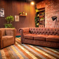 Самый уютный зал в теплых оттенках и деревянной стеной!
