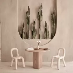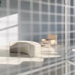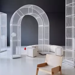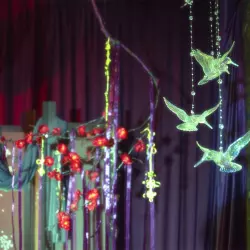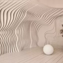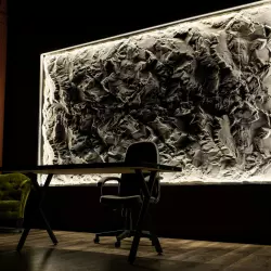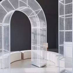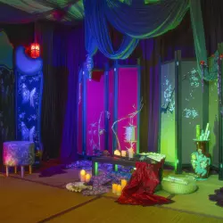 Зал с декорациями различных форм и цветов с панорамным окном и высокими потолками. Все фигуры легко передвигаются по залу.