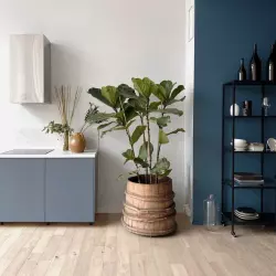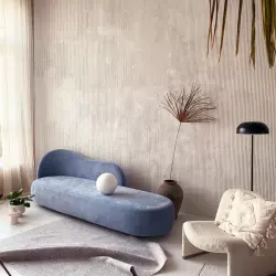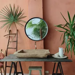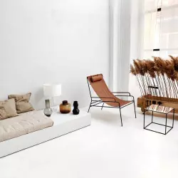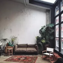 Интерьерный зал в африканском и тропическом стиле, с панорамными мансардными окнами, растениями и красивой мебелью.
