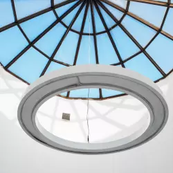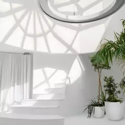 Белый просторный зал под куполом, прямые солнечные лучи падают на пол и стены, передвигаются в течение дня по всему пространству. Высокий панорамный потолок. Лестница, колонны, зеркальная зона, драпировочные ткани. Возможность установки любого фона из наличия.