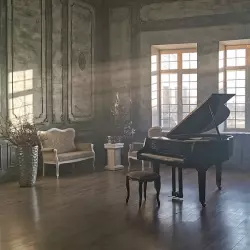 Роскошный светлый зал в классическом стиле, винтажные полы под дерево и настроенный черный рояль.