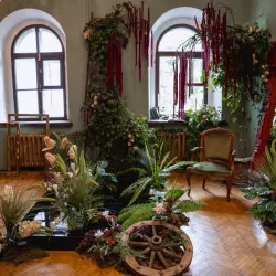 Зал "Лекторий" на ВДНХ. Белая большая циклорама, солнечная сторона, подъемная ферма для крепления светового оборудования и элементов декорации. Зона оранжереи с зелеными растениями и медной ванной.