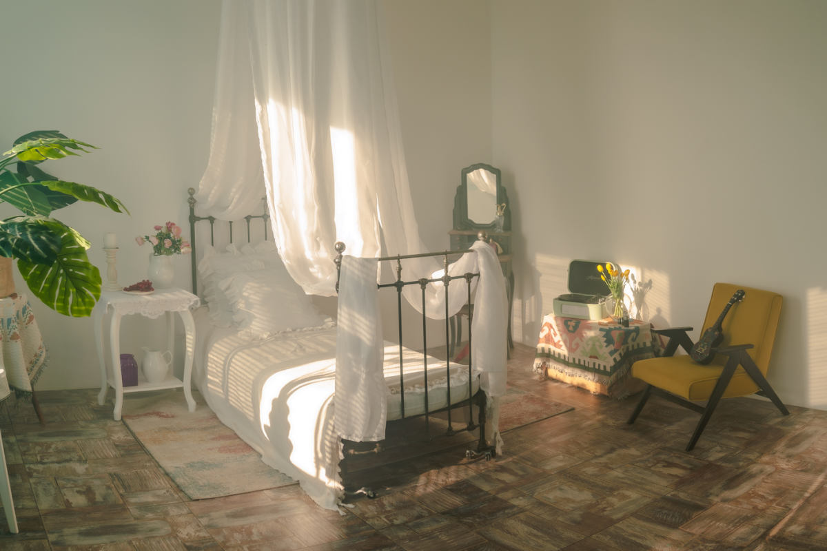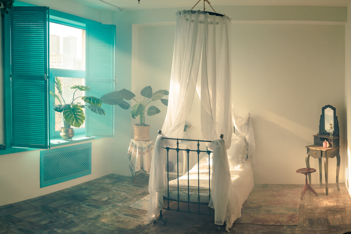 Новый, очень светлый зал с циклорамой, кроватью и панорамными окнами. Белая стена, оформленная 3D панелями"волны".