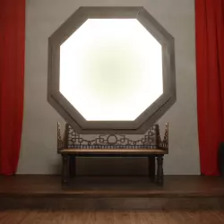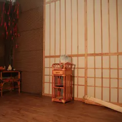 Аутентичный китайский антураж с большим количеством реквизита. 2 постоянных источника освещения. Светодиодная подсветка в окне с отдельным включением. Крепления для подвеса.