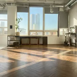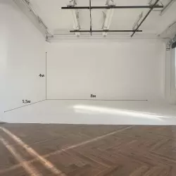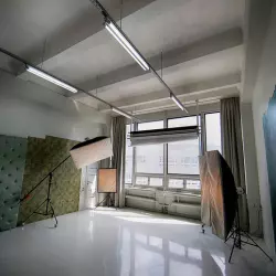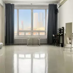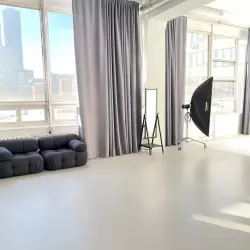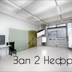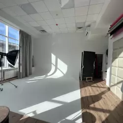 Просторный зал площадью 100 кв. метров с угловой циклорамой, панорамными окнами на солнечной стороне.
